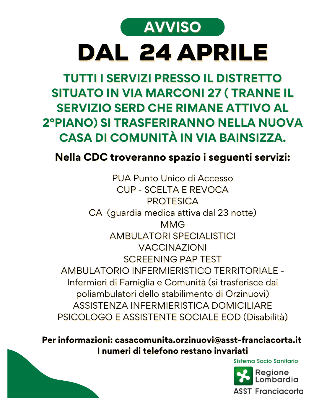 TUTTI SERVIZI PRESSO IL DISTRETTO SITUATO IN VIA MARCONI 27 tranne il servizio serd che rimane attivo al 2°piano, si trasferiranno nella nuova Casa di Comunità in via Bainsizza.