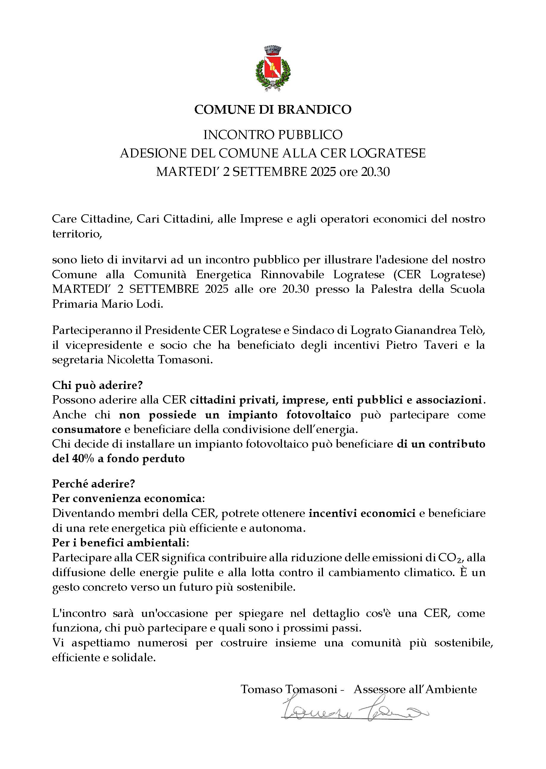 INCONTRO PUBBLICO ADESIONE DEL COMUNE DI BRANDICO ALLA CER LOGRATESE MARTEDI’ 2 SETTEMBRE 2025 ore 20.30 presso la Palestra della Scuola Primaria Mario Lodi di Brandico
